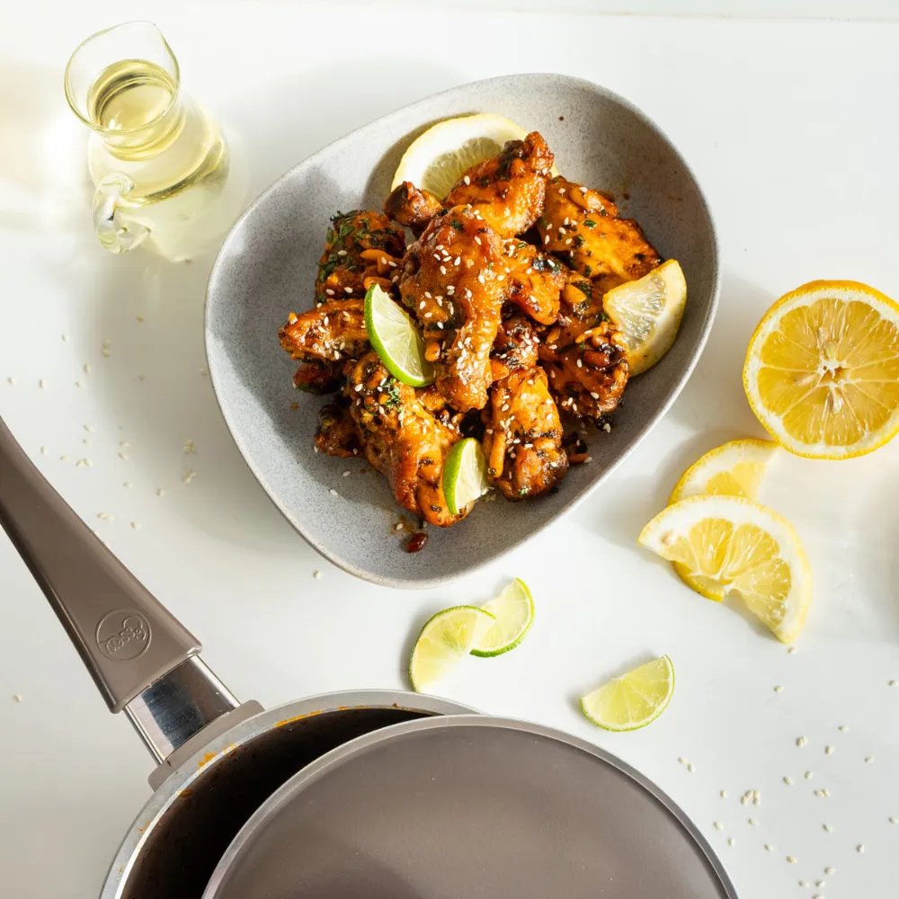 En la Cacerola, a Fuego Fuerte, colocar un poco de aceite, incorporar ajo en láminas y las alitas de pollo, dorar muy bien de todos lados. Mezclar el jugo de limón, el cilantro picado, el aceite de oliva, la miel y volcar todo a la Cacerola. Tapar y cocinar por 20 minutos. Incorporar el maní.
