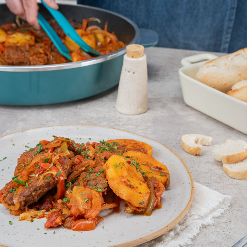 Calentamos la Sartén tapada a Fuego Máximo por 2 minutos. Rociamos con un hilo de aceite, colocamos los bifes y los doramos a Fuego Máximo de ambos lados. Agregamos la cebolla, el ajo y los morrones cortados en juliana, tapamos y cocinamos a Fuego Mínimo para que se rehoguen.