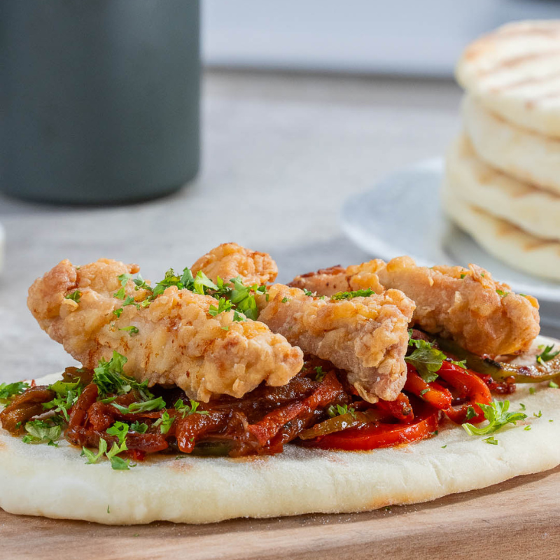 Para el salteado, precalentamos la sartén a Fuego Máximo por dos minutos, salteamos los morrones cortados en juliana, los tomates y la cebolla. Agregamos ají picante picado y terminamos con perejil fresco y un chorrito de aceite. Montamos el salteado sobre el pan, colocamos encima el cerdo frito y finalizamos con perejil picado.
