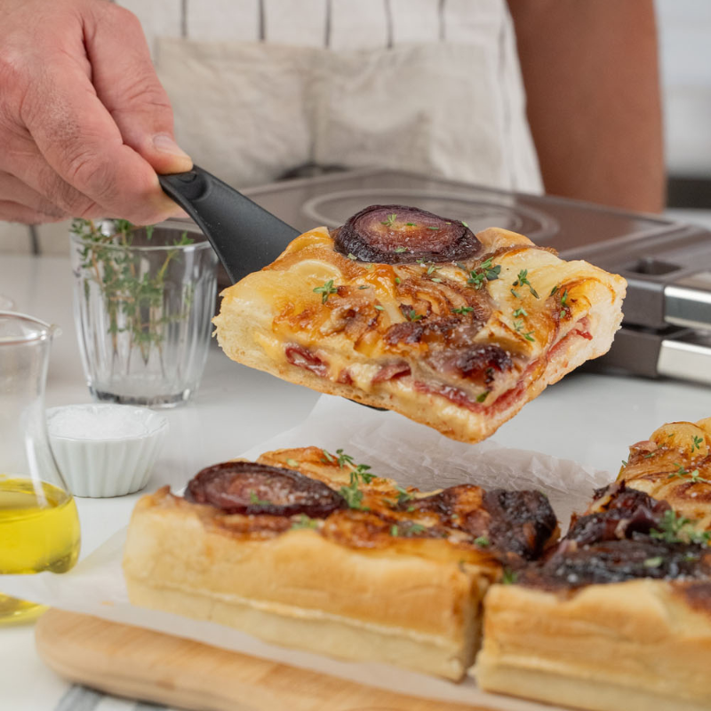 En una de las partes de la filp añadimos 2 cucharadas de aceite de oliva, esparcimos las cebollas, ubicamos una de las masas, distribuimos jamón queso y la masa restante estirado de igual manera, esparcimos aceite sobre esta masa. Tapamos y dejamos descansar en un lugar tibio 20 minutos.