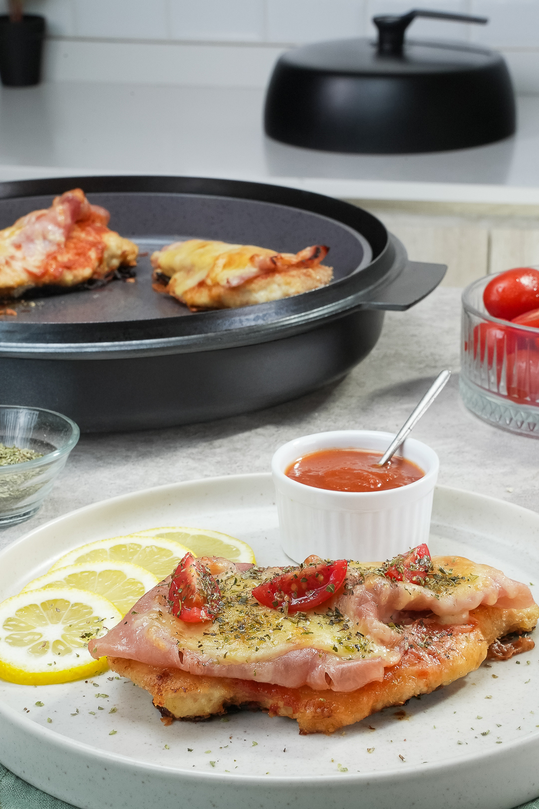 Cortamos las supremas de pollo a la mitad. Las pasamos por la huevada y luego por pan rallado. Reservamos. Precalentamos el Kamado a 200° y colocamos las milanesas sobre la bandeja, tapamos. Cocinamos por 10 minutos a Fuego Máximo, retiramos la tapa, damos vuelta y colocamos salsa de tomate, queso mozzarella rallado y las fetas de jamón cocido. Volvemos a tapar y cocinamos por 10 minutos más. Apagamos el fuego, dejamos por 10 minutos dentro del kamado y retiramos la bandeja con la pinza extractora. Servimos con orégano y tomates cherrys.