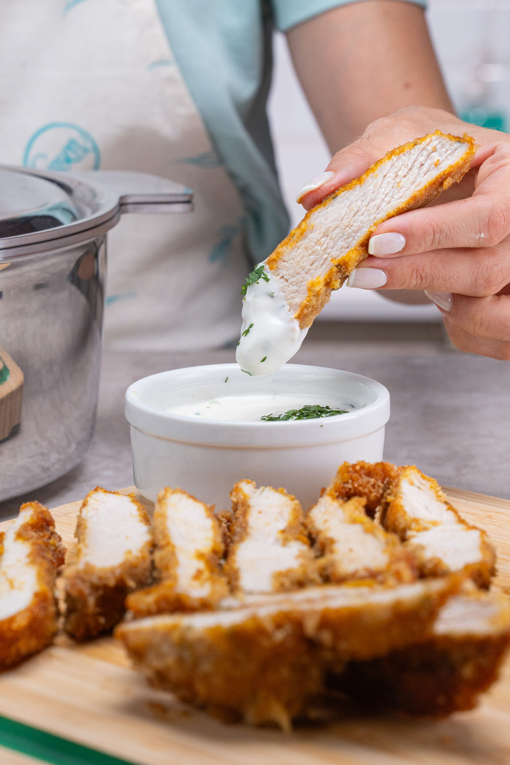 Mezclar los huevos con el ajo, el perejil, y la sal. Pasar las supremas por el huevo y luego empanar con panko. Colocar el Cestillo dentro de laCacerola y precalentar el aceite a Fuego Máximo. Colocar el pollo, tapar y freír a Fuego Medio hasta dorar.Para la salsa, mezclar el yogur natural con el jugo de una lima, la miel y el cilantro picado.