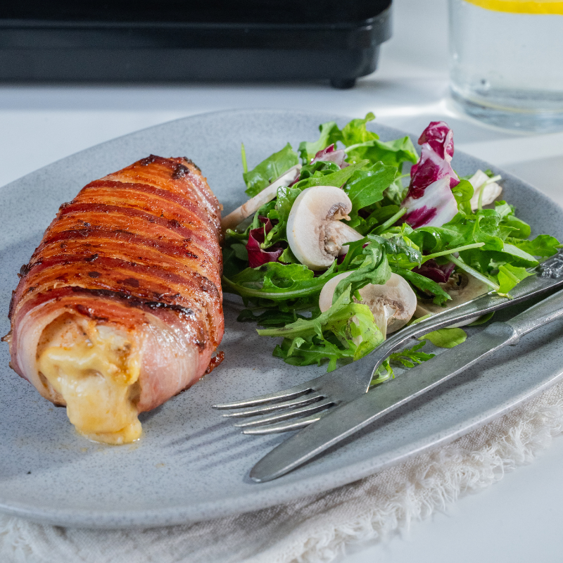 Marinamos las pechugas con pimentón, perejil picado, y aceite. Con el Cuchillo Utility hacemos un orificio sobre la parte más gruesa de la pechuga, rellenamos con un bastón de queso. Envolvemos en tiras de panceta.