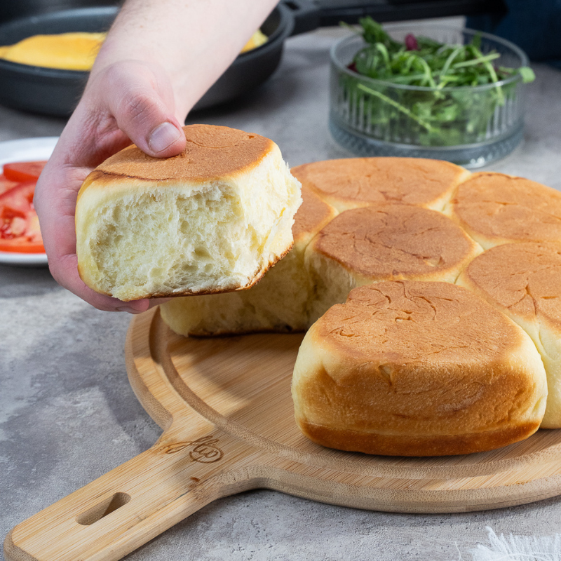 Dejamos descansar y dividimos en 7 bollos. Colocamos los bollos en la Flip Nuit y cocinamos a Fuego Corona por 20 minutos, damos vuelta y seguimos cocinando por 10 minutos más.
