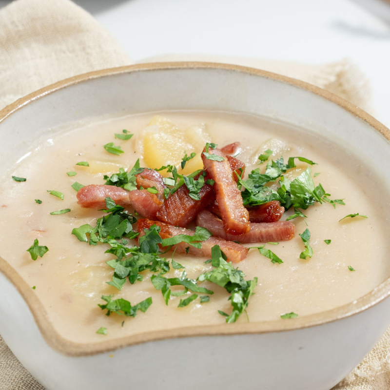 Separamos un poco de la papa ya cocida, mixeamos en un bowl y volvemos a incorporar a la Cacerola para darle más untuosidad a la sopa junto con la crema de leche. Dejamos cocinar 20 minutos más hasta que quede bien cremosa.