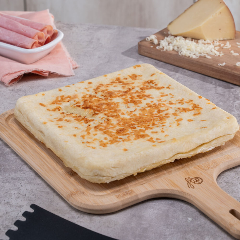 Rellenamos con jamón cocido en fetas, queso, morrón y huevo duro, humedecemos los bordes y cubrimos con la otra tapa de masa. Por encima agregamos queso rallado, cerramos la Flip y cocinamos durante 20 minutos a Fuego Corona. Giramos la Flip y continuamos la cocción por 15 minutos más a Fuego Corona. Finalmente, desmoldamos y servimos.