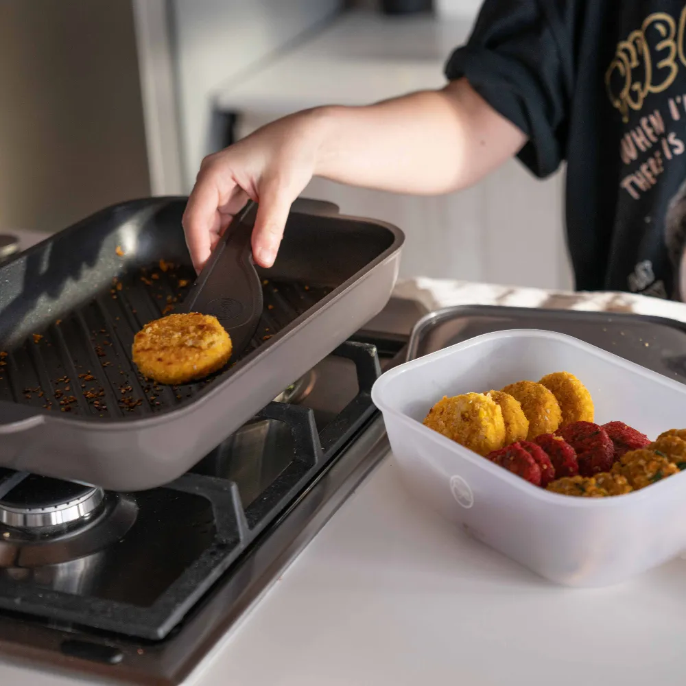 Precalentamos la Bifera 3’ a FUEGO MEDIO y cocinamos las croquetas con un poco de aceite de oliva hasta que estén doradas de ambos lados.