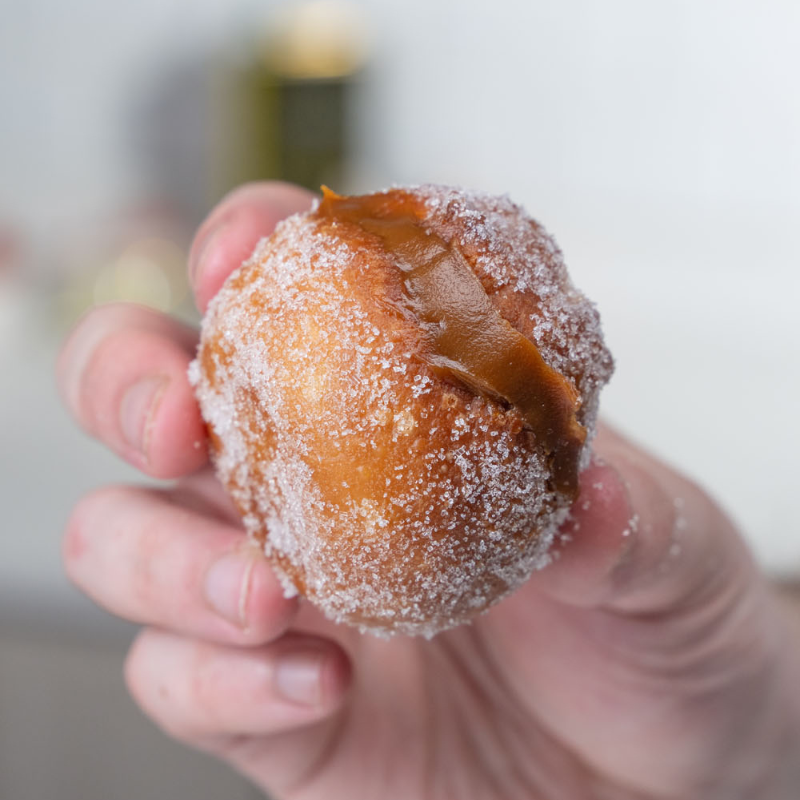 En un bowl colocamos la harina, el azúcar,la sal, la levadura, los huevos y la leche, comenzamos a amasar y por último incorporamos la manteca. Dejamos descansar y hacemos bollos entre 30 y 40 gr de masa. Bollamos la masa, los colocamos en una placa y dejamos levar al doble. En la Cacerola colocamos aceite, tapamos y esperar a que se caliente a Fuego Máximo por dos minutos. Bajamos a Fuego Mínimo, colocar las bolas de fraile en el cestillo freidor y las sumergimos en el aceite. Las cocinamos hasta que estén doradas. Retiramos de la Cacerola y las pasamos por azúcar. Les hacemos un corte y rellenamos con dulce de leche.