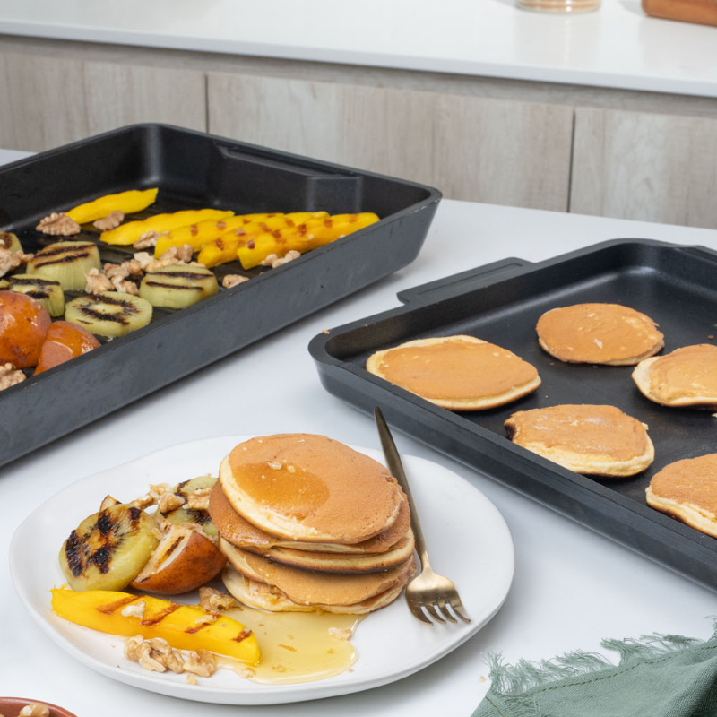 Precalentamos la Plancha y colocamos un poco de la preparación de los pancakes, damos vuelta y cocinamos del otro lado. Cortamos la fruta y la asamos con un poco de manteca, miel y las nueces partidas. Servimos los pancakes con la fruta asada, acompañamos con miel.