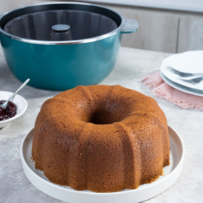 Precalentamos la Cacerola a Fuego Máximo por 2 minutos, bajamos a Fuego Medio y colocamos el savarín. Cocinar por 35 minutos. Dejamos enfriar y desmoldamos.