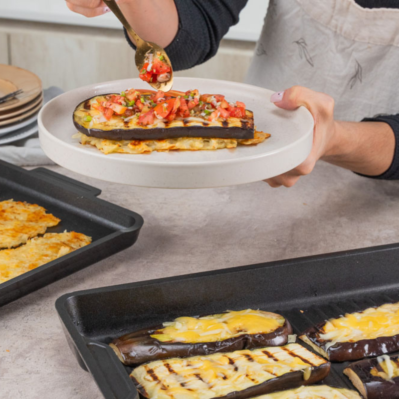 Ubicamos la urban en las dos hornallas a fuego medio distribuimos las berenjenas y grillamos.